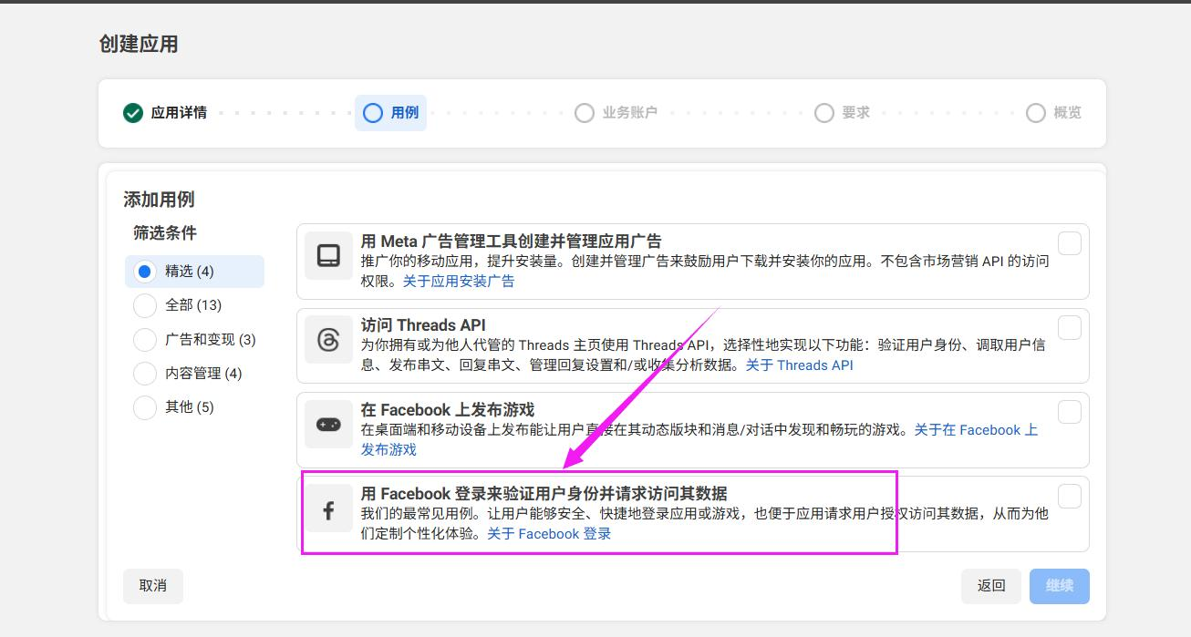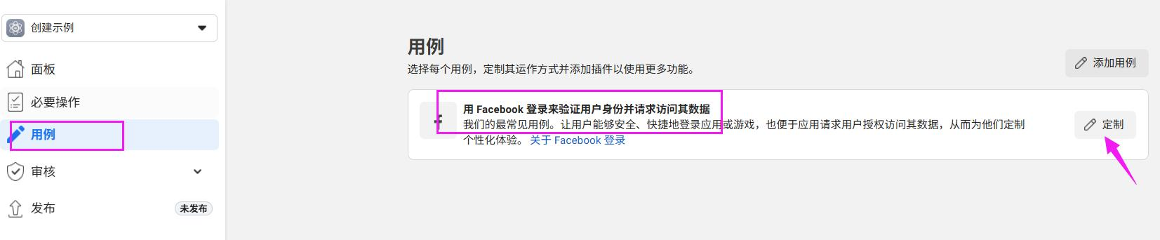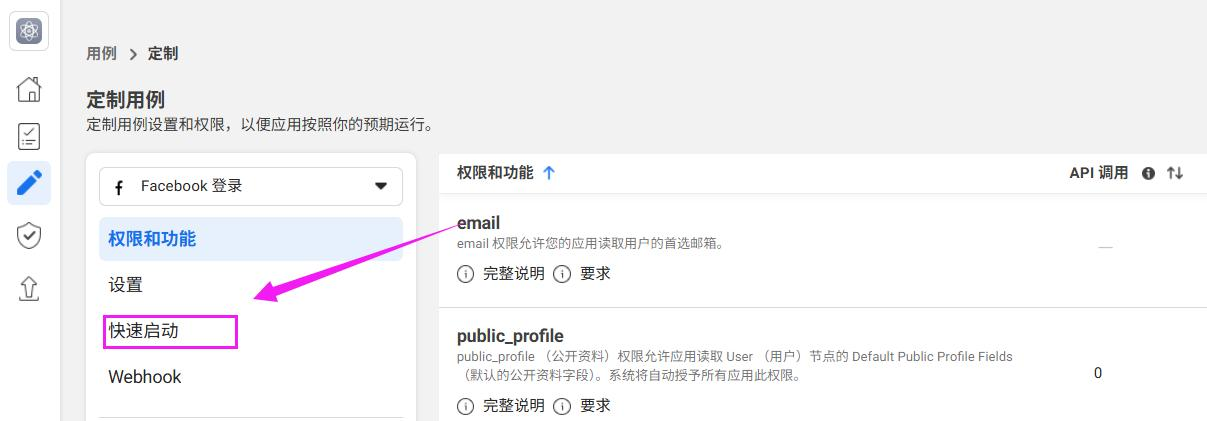创建完成后,在应用面板选择用例,选[用facebook登录...]里面的定制 --->快速启动